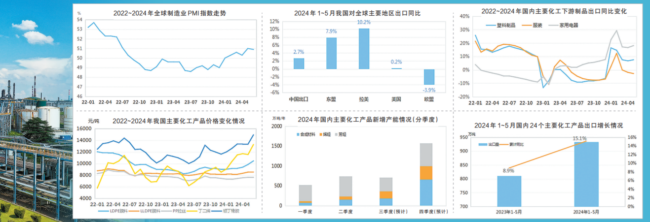 與此同時,全球制造業(yè)回暖,在海外補(bǔ)庫存需求的提振下,產(chǎn)品出口增長逐步恢復(fù)。6月,全球制造業(yè)PMI為50.9%,連續(xù)5個月位于擴(kuò)張區(qū)間,美國多數(shù)行業(yè)進(jìn)入補(bǔ)庫存階段,全球貿(mào)易景氣度明顯改善。今年1~5月,我國出口總值(以美元計)同比增長2.7%,增速較去年同期提升4.1個百分點,其中,對東盟、拉美等新興經(jīng)濟(jì)體的出口量高于對美國、歐盟等發(fā)達(dá)經(jīng)濟(jì)體的出口量,與化工產(chǎn)品相關(guān)的塑料制品、服裝、家用電器等產(chǎn)品出口觸底回升,24個主要化工產(chǎn)品累計出口932.8萬噸,同比增長15.1%。